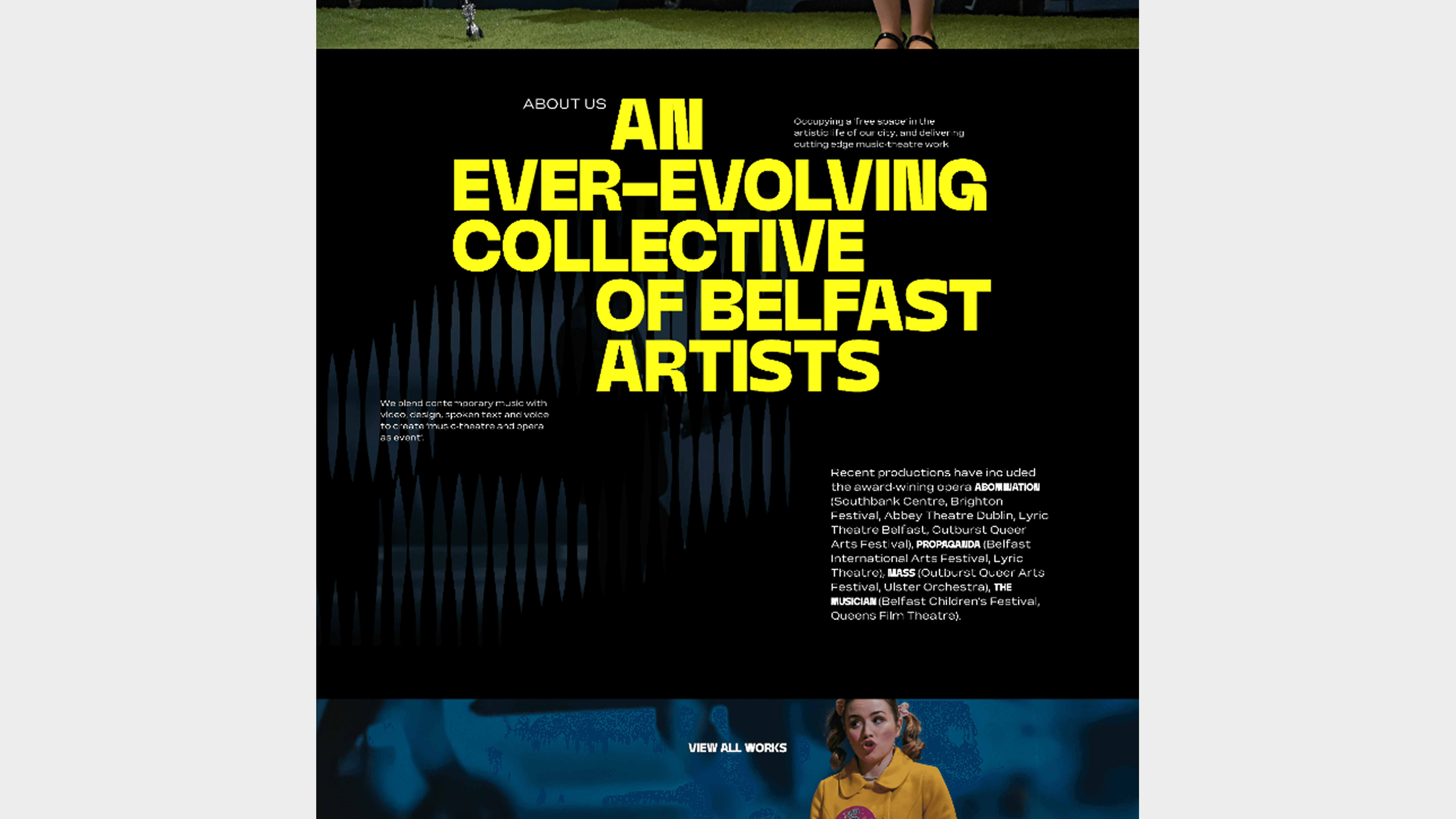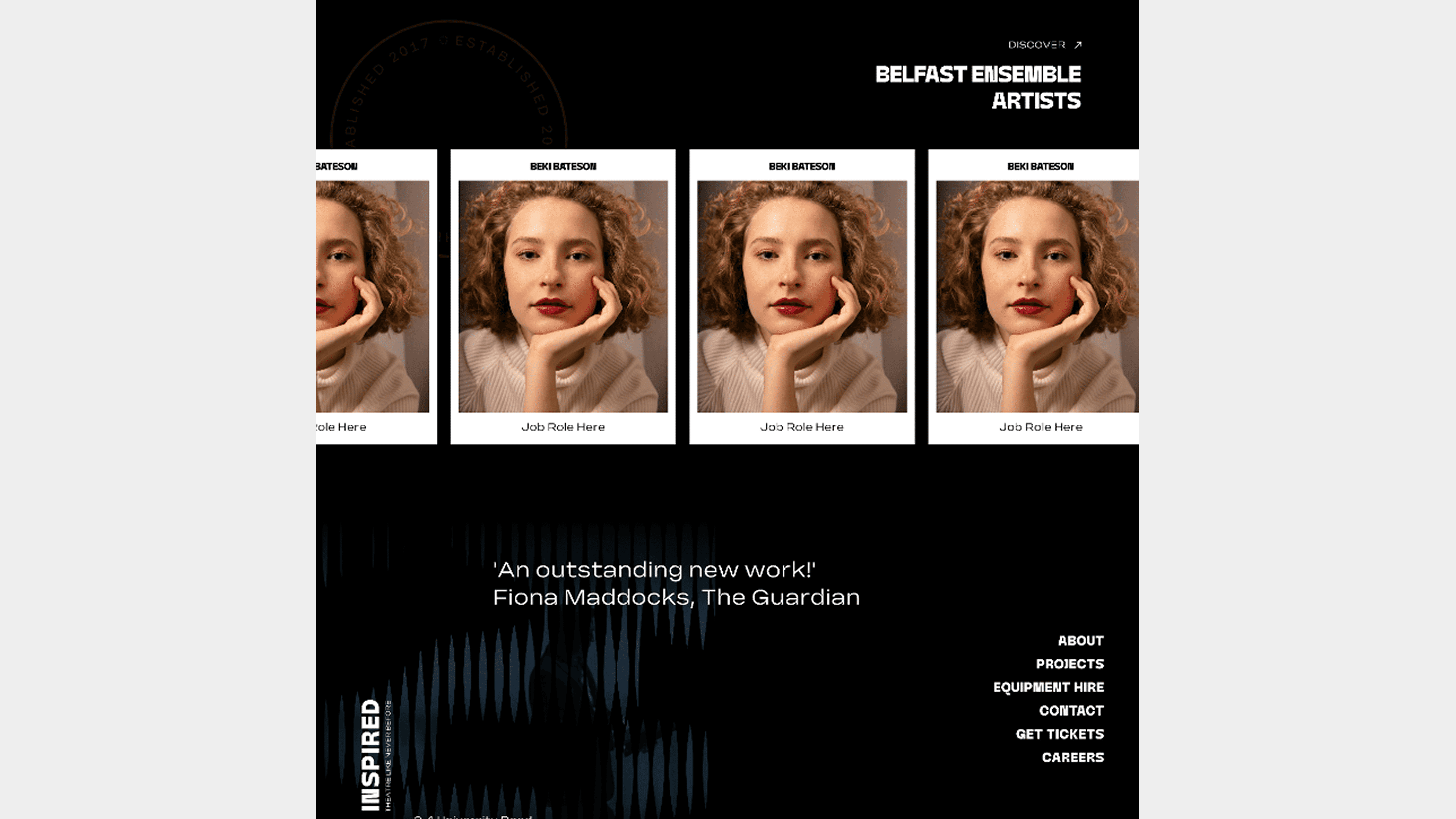 The site was designed to be highly interactive incorporating animation and seamless transitions that helped bring the content to life. From the initial loading screen to the details of each component I made sure the site felt like an unfolding narrative. I integrated movement and fluidity throughout the site to keep users engaged and intrigued as they explored upcoming shows, past productions and the company’s vision. The end result was a vibrant, high-energy website that mirrored the daring spirit of Belfast Ensemble's rebrand, effectively capturing the excitement and creativity that define their performances.